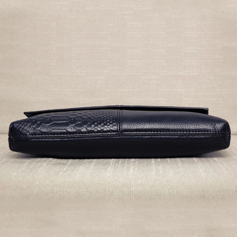 Realizzata in pelle nera con finitura liscia e pannello superiore effetto Pitone. Interno in tessuto resistente e dettagli metallici cromati.