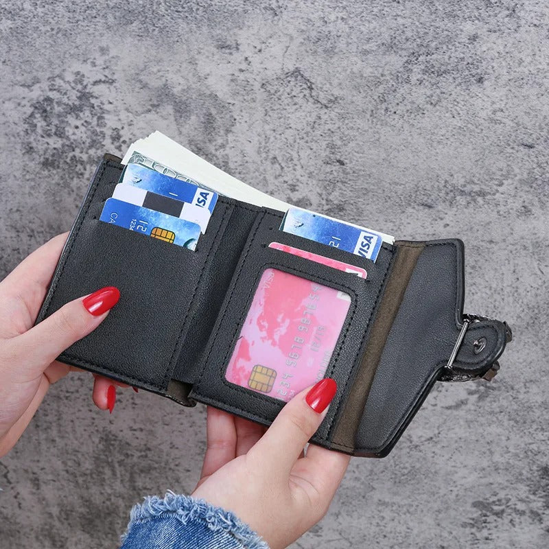 Portafoglio donna compatto ed elegante, ideale per l’uso quotidiano. Realizzato in similpelle martellata di qualità, unisce stile e praticità in un design moderno e femminile. La chiusura frontale con fibbia decorativa color canna di fucile aggiunge un dettaglio sofisticato che valorizza il look.