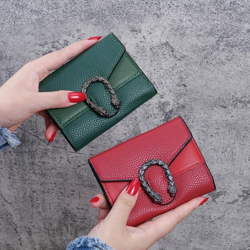 Un portafoglio compatto dal design raffinato, impreziosito da una fibbia decorativa e da un colore rosso intenso che aggiunge carattere a ogni look.